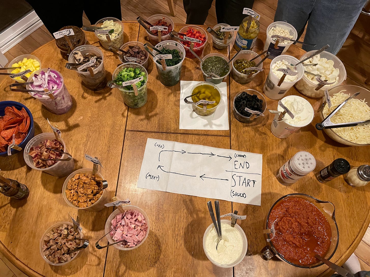 This year, the 20th year, there were 69 pre-baked crusts, 30 toppings to choose from, an expeditor,2 52 finished pizzas, an official reading, an official song, a traditional song, name tags, and a guest DJ. I took a week off from work to prepare,3 and I’m still trying to figure out what to do with the leftovers.
