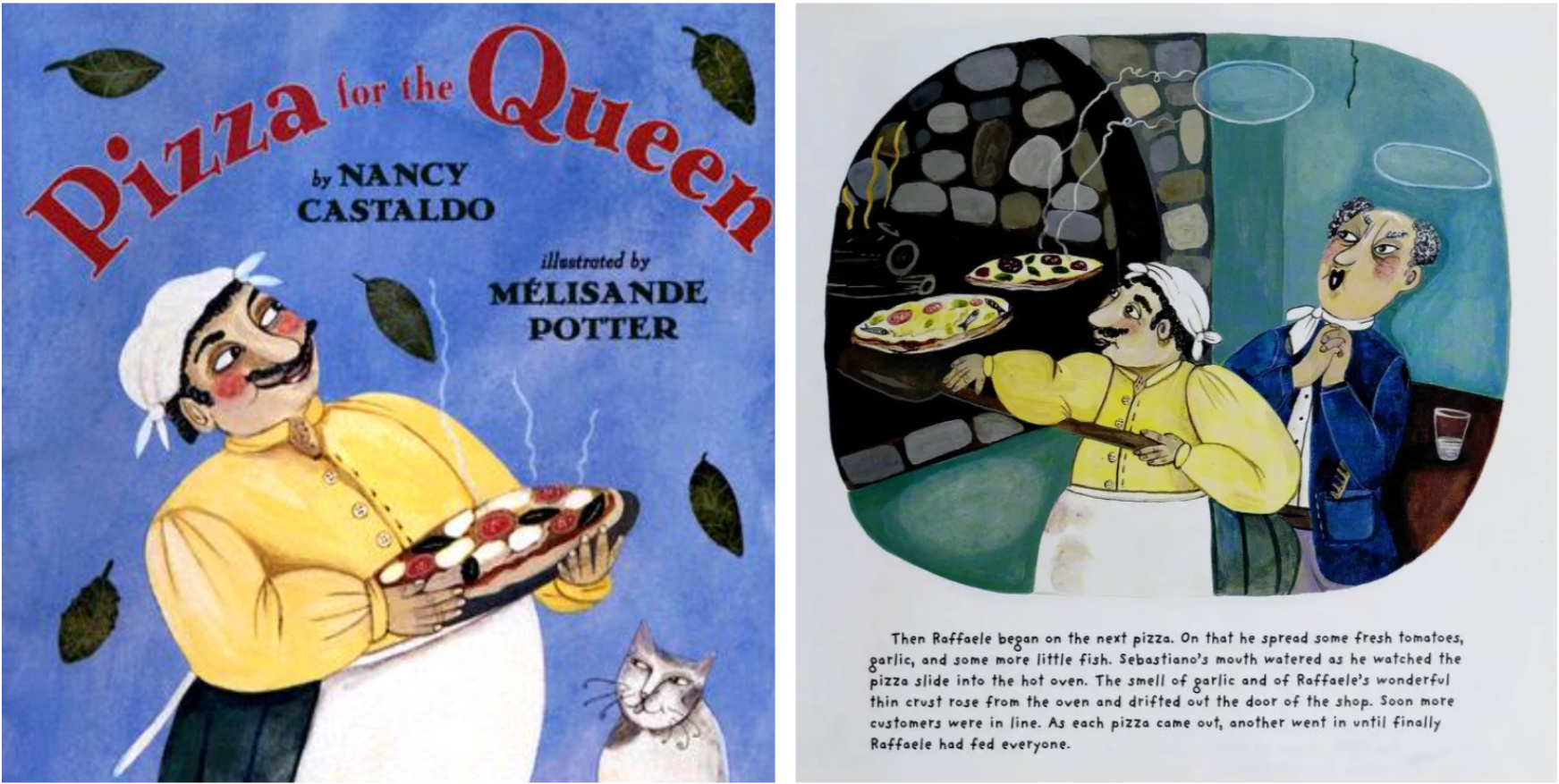 When my oldest child was five, early in 2006, we read Pizza for the Queen by Nancy Castaldo. It’s a simple story: Raffaele, a Neapolitan baker, learns one morning in 1889 that Queen Margherita wants him to make her a pizza. He spends the day shopping for ingredients, feeding his customers, and, ultimately, inventing a pie featuring red, white, and green toppings in honor of the Italian flag.